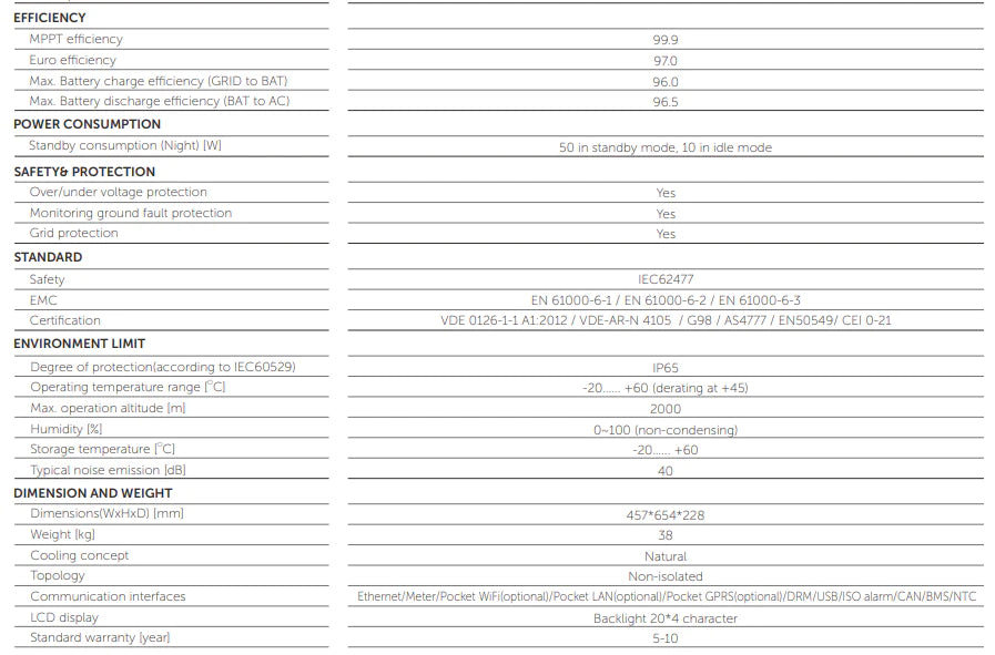 These features make the inverter suitable for a range of applications, providing compatibility with high voltage batteries, robust protection, and emergency power supply functionality. The ability to parallel up to 5 units enhances flexibility in designing and scaling solar energy systems.
